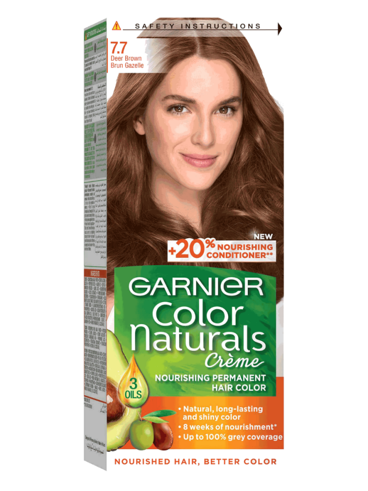 غارنييه كولور ناتشرلز صبغة شعر 7.7 بني غزالي تمنحك لونًا غنيًا وطبيعيًا لشعرك، مما يساعد في إخفاء الشيب ومنحك مظهرًا شابًا وحيويًا. تحتوي هذه الصبغة على مكونات مغذية تساهم في ترطيب الشعر وتغذيته أثناء عملية الصبغ. تعتبر هذه الصبغة مثالية لكل من تبحث عن لون يدوم طويلاً مع الحفاظ على صحة الشعر ولمعانه.