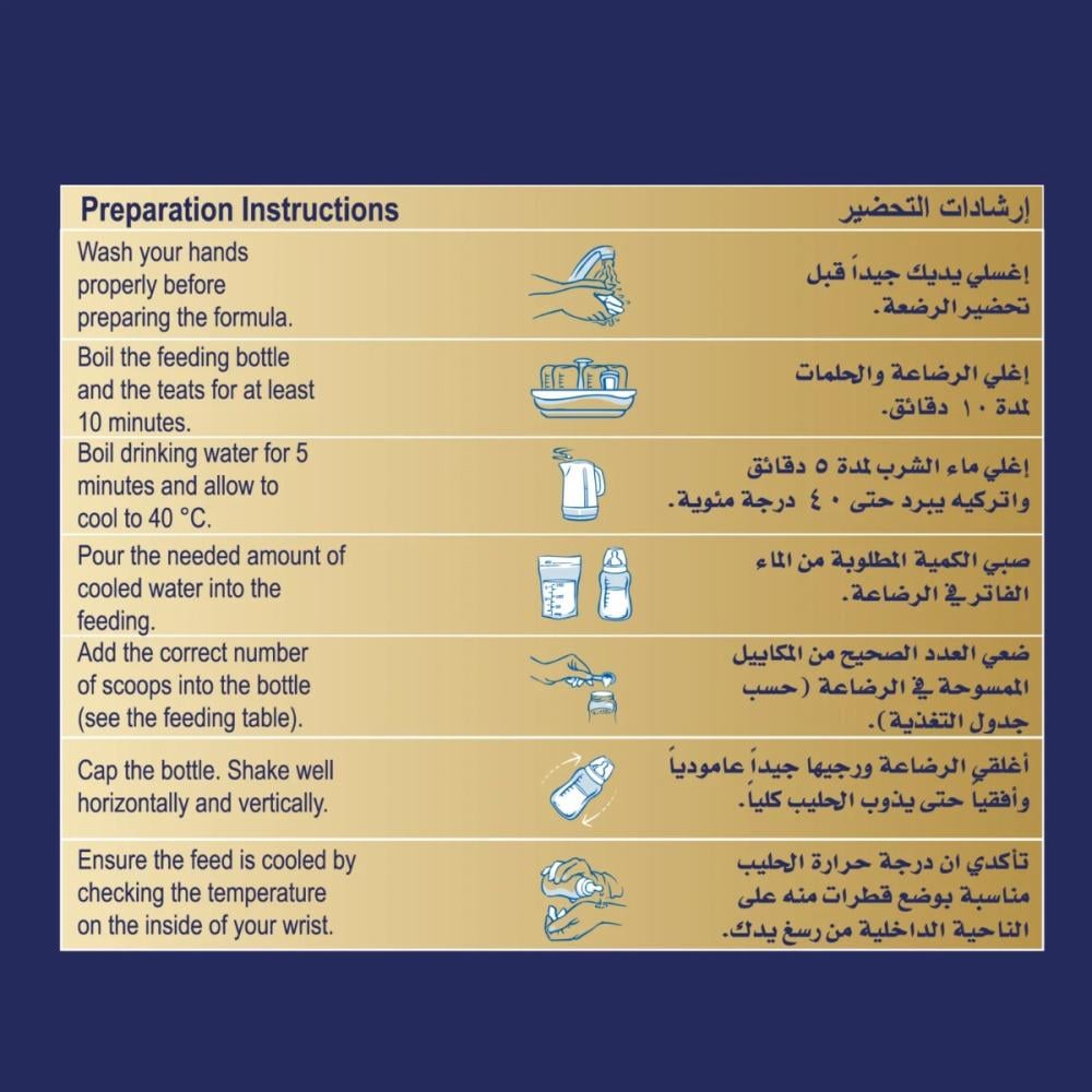 يجب تحضير الحليب وفقًا للتعليمات الموجودة على العبوة، مع التأكد من استخدام ماء نظيف ومغلي.